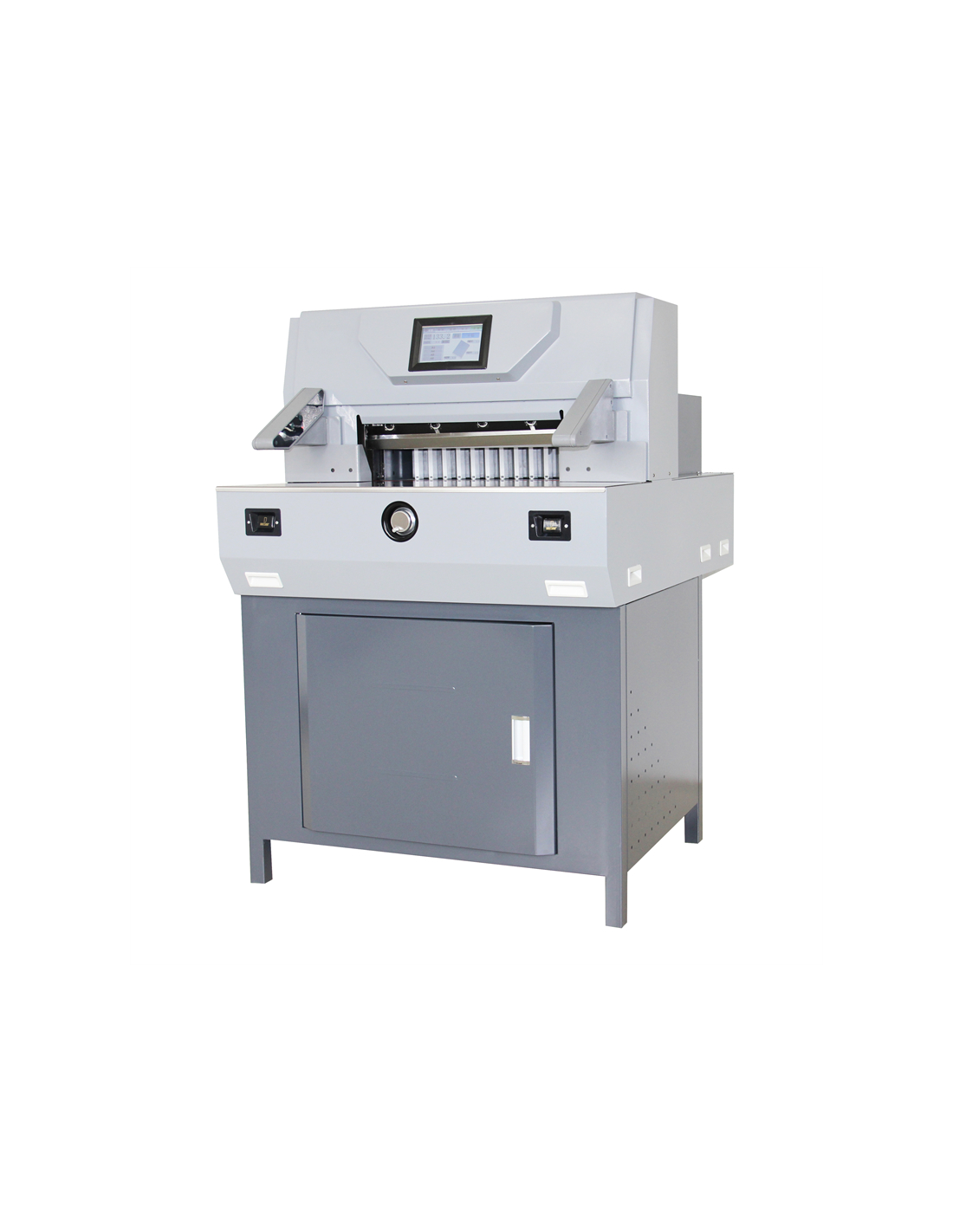 Nowoczesna gilotyna elektryczna z automatycznym dociskiem oraz automatycznym posuwem. Urządzenie posiada automatyczny napęd noża, docisku i posuwu a także laserowy wskaźnik linii cięcia. Gilotyna posiada elektroniczny panel sterowania z programatorem. Wyposażona jest także w elektroniczną funkcję wysuwania papieru siodłem.